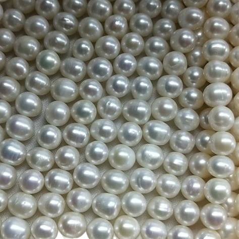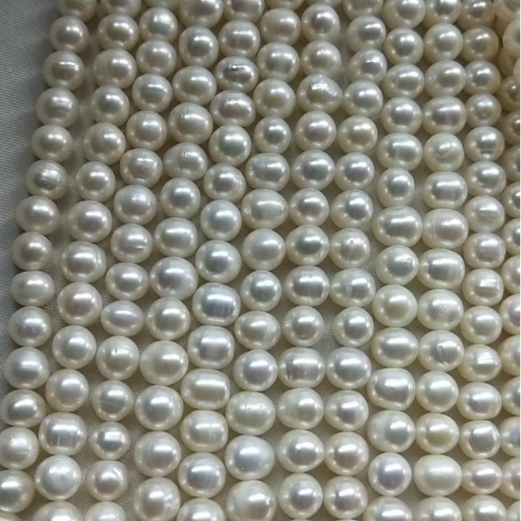 สร้อยคอมุกน้ำจืดทรงเกือบกลม ขนาด 7-8 มม. มีตำหนิเล็กน้อย สีขาว แบบกึ่งสำเร็จรูป ขายส่ง