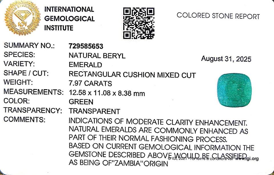 มรกตทรงคุชชั่นสีเขียว 7.97 กะรัต จากพลอยแซมเบีย