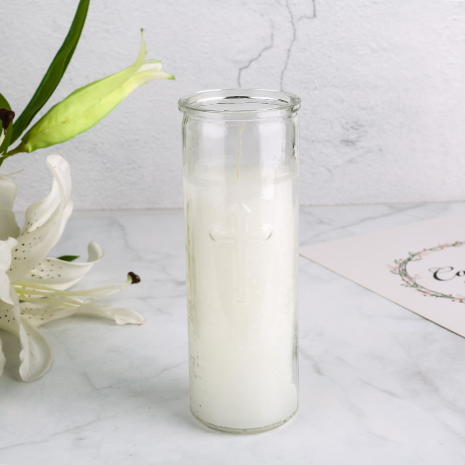 เทียนพาราฟินในขวดแก้ว 7 วัน สำหรับศาสนาคริสต์นิกายคาทอลิก ไม่มีเปลวไฟ ไม่มีกลิ่น ความสูง 8 นิ้ว สำหรับการสวดมนต์