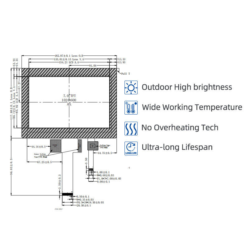 หน้าจอแสดงผล TFT LCD ขนาด 7 นิ้ว ความละเอียด 1024x600 ความสว่างสูง 1600nits แบบ IPS LVDS รองรับอุณหภูมิกว้าง