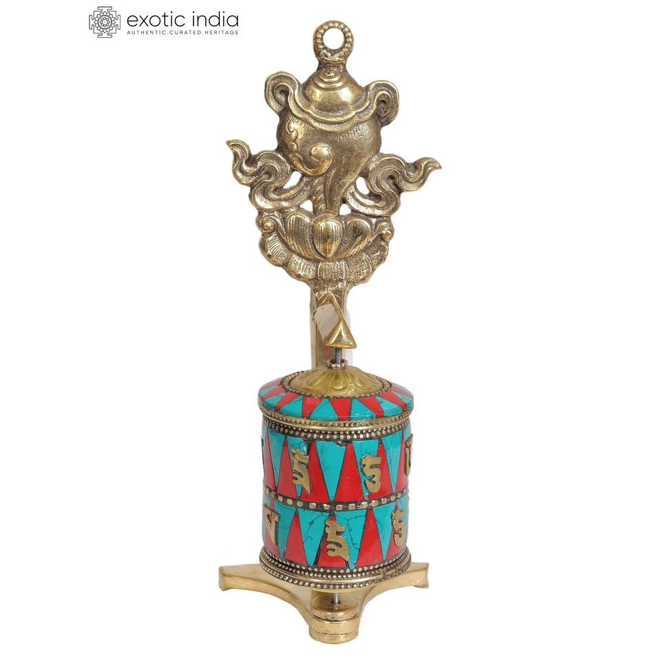 ล้อสวดมนต์ชาวพุทธทิเบตทำด้วยมือขนาด7นิ้วพร้อมหอยสังข์ (ashtamangala) ของตกแต่งบ้านทำจากทองเหลืองสำหรับเป็นของขวัญผลิตในอินเดีย