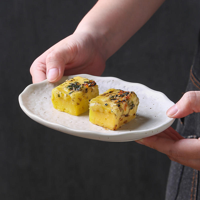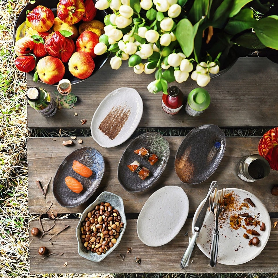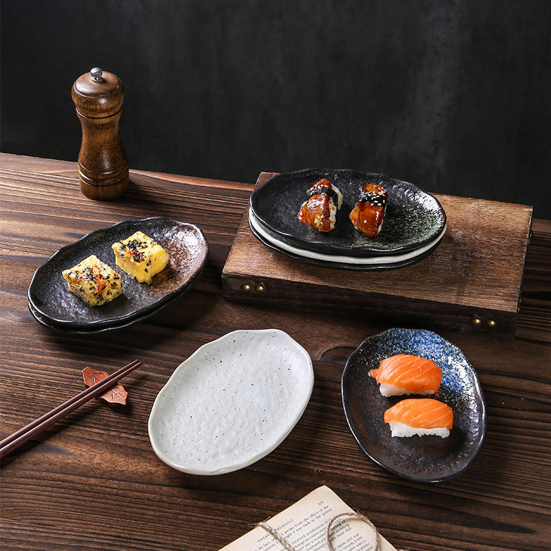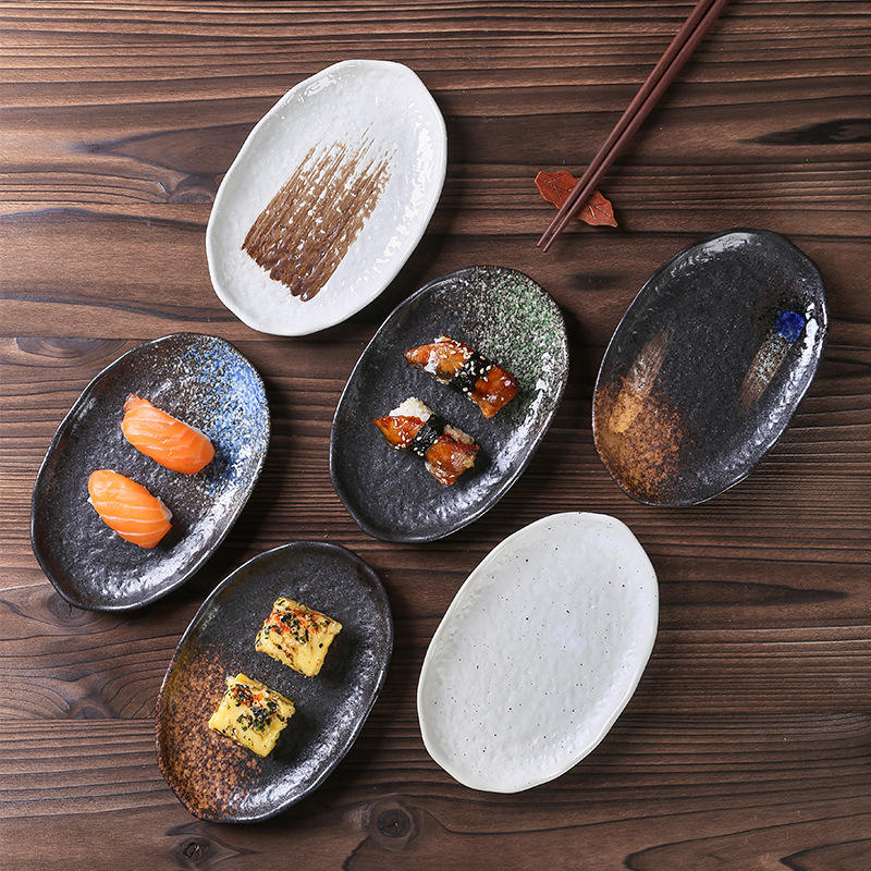 จานซูชิเซรามิกทรงรีขนาด 7 นิ้ว เคลือบแบบ Reactive Glaze สำหรับอาหารญี่ปุ่น ร้านอาหาร โรงแรม และภาชนะบนโต๊ะอาหาร