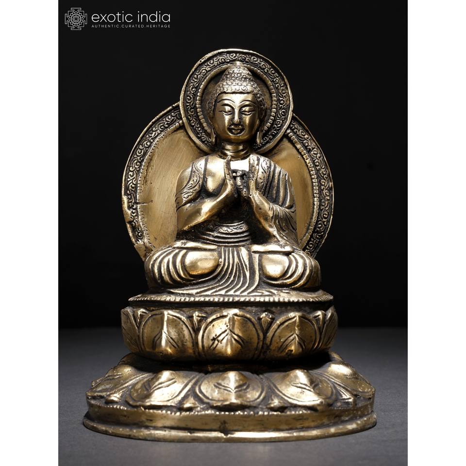 รูปปั้นทองเหลืองพระพุทธเจ้าขนาด7นิ้ววางอยู่บนแท่นดอกบัวพร้อมประติมากรรม dharmudra