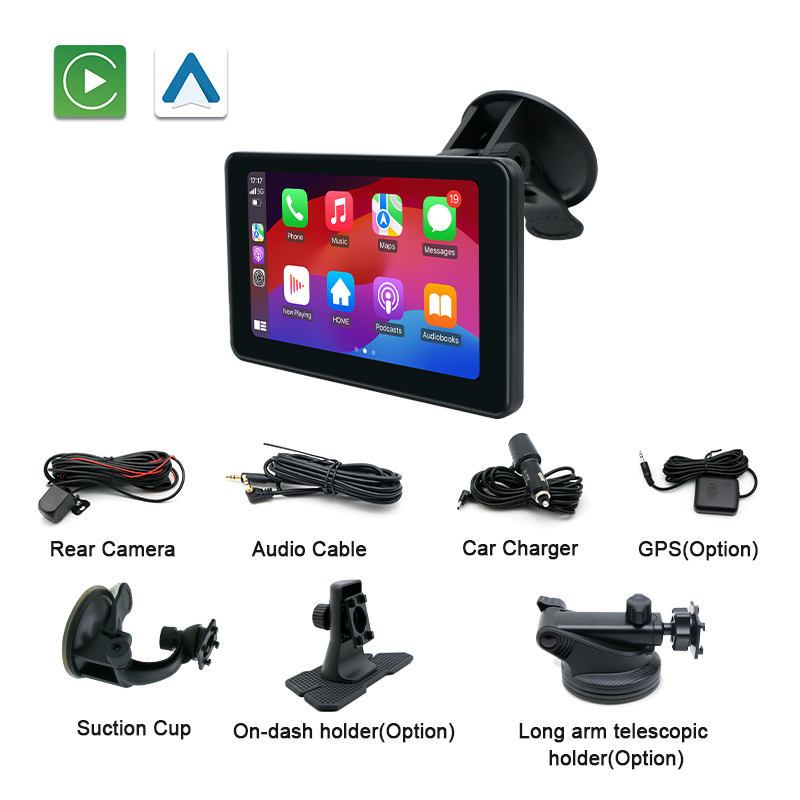 หน้าจอคาร์เพลย์แบบพกพาขนาด 7 นิ้วเครื่องเล่นมัลติมีเดียหน้าจอสัมผัสบลูทูธ FMT Airplay Miracast Audio Out