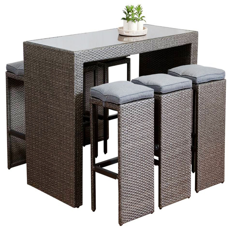 ชุดบาร์หวายกลางแจ้งทันสมัย7ชิ้นพร้อมเก้าอี้รองรับแรงกระแทก6ที่นั่งสำหรับใช้ในสวนและวิลล่า