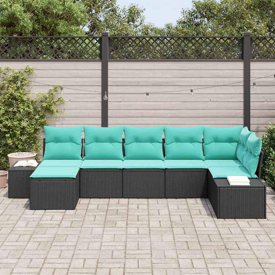 ชุดโซฟาสวนหวายโพลีสีดำ 7 ชิ้นพร้อมเบาะรองนั่ง