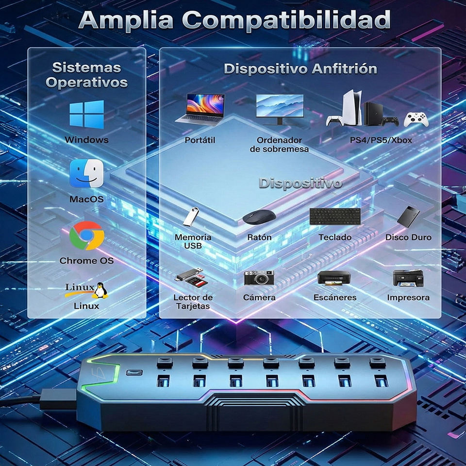 ฮับ USB 3.0 Type C 7 พอร์ต พร้อมไฟ RGB LED แบบแยกสวิตช์ ตัวฮับทำจากอลูมิเนียมอัลลอยด์ ทนทาน ความเร็ว 5GBPS เพื่อการถ่ายโอนข้อมูลอย่างรวดเร็ว