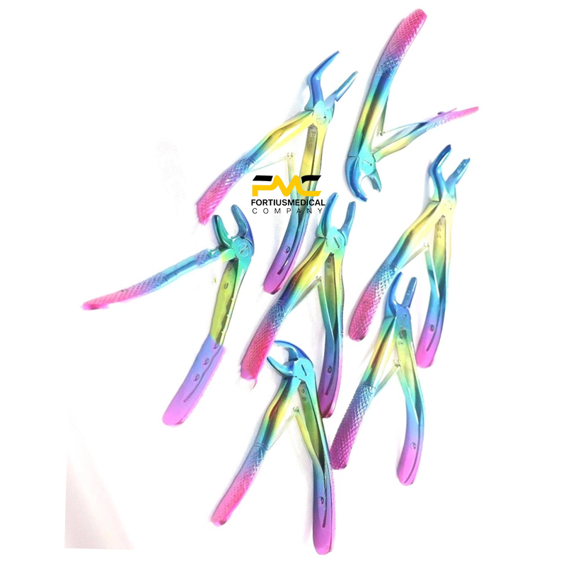 ชุดคีมถอนฟันเด็ก 7 ชิ้น ผลิตจากเหล็กกล้าไร้สนิมเยอรมัน เคลือบสีรุ้ง สำหรับการถอนฟันในเด็ก