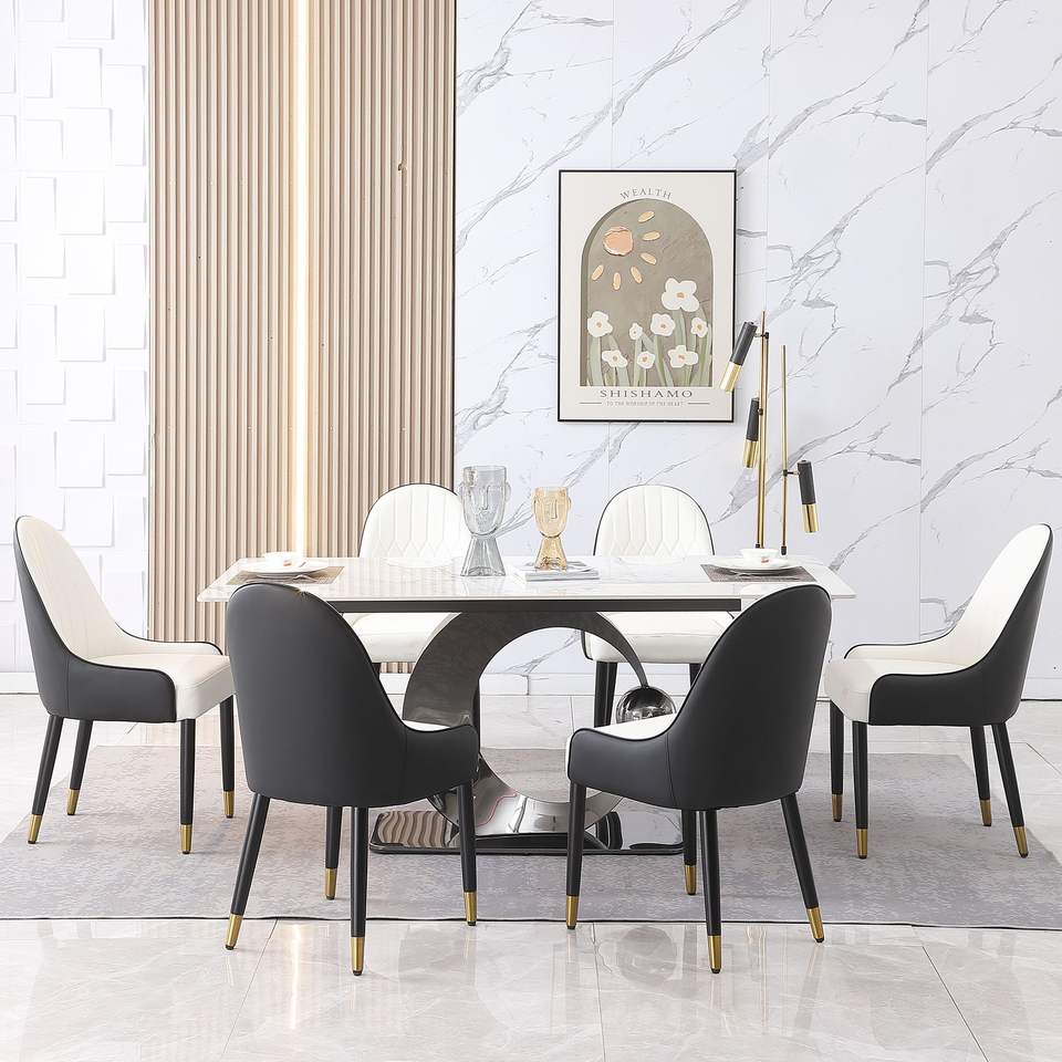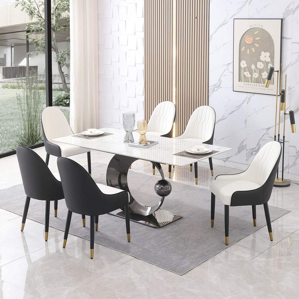 ชุดห้องรับประทานอาหารขนาด71นิ้วพร้อมฐานแท่นเหล็กคาร์บอนสีขาวคาร์รารา6ชิ้นเก้าอี้มีโต๊ะหินเก้าอี้6ชิ้น