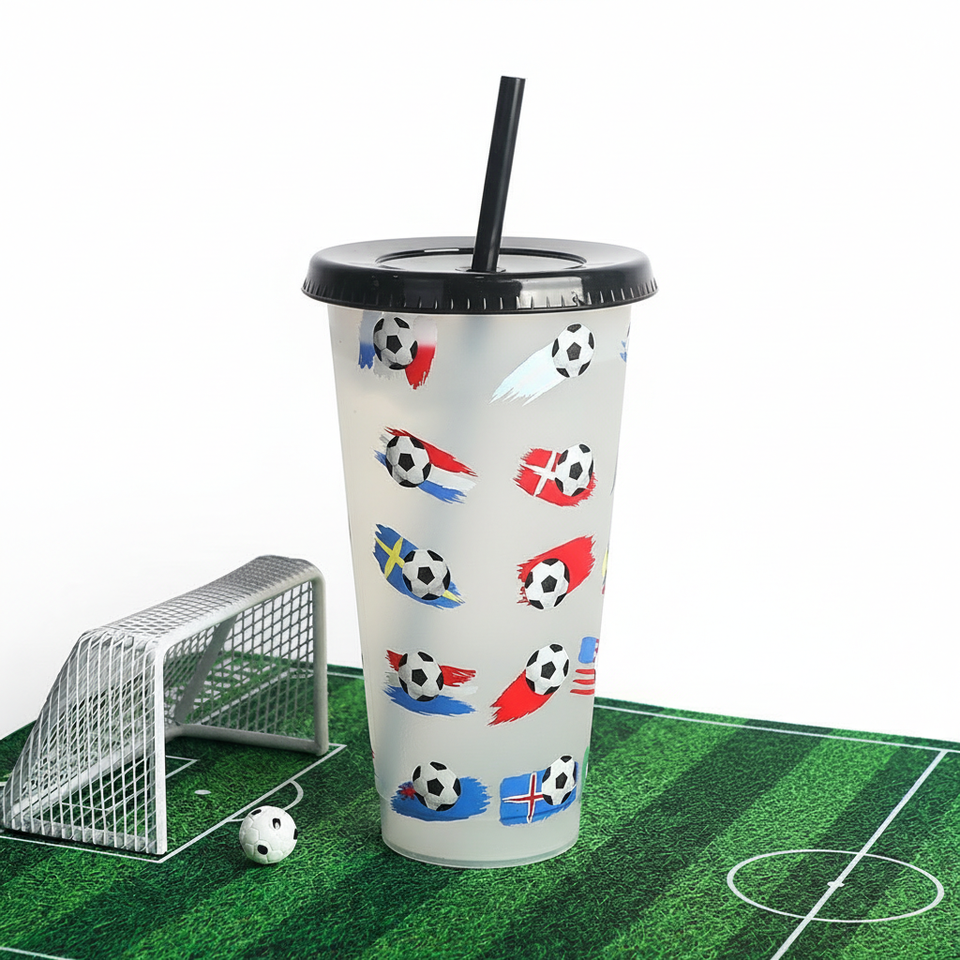 แก้วน้ำพลาสติก PP ขนาด 710 มล. ลายฟุตบอล พร้อมหลอดดูด พิมพ์ลายแบบ Thermal Transfer เป็นมิตรกับสิ่งแวดล้อม