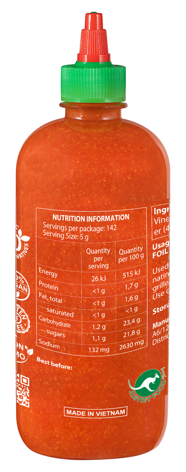 ส่วนผสม:พริก (76.8%), กระเทียม, น้ำส้มสายชูข้าว, เกลือ, น้ำตาล
