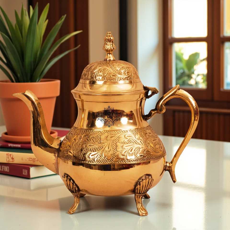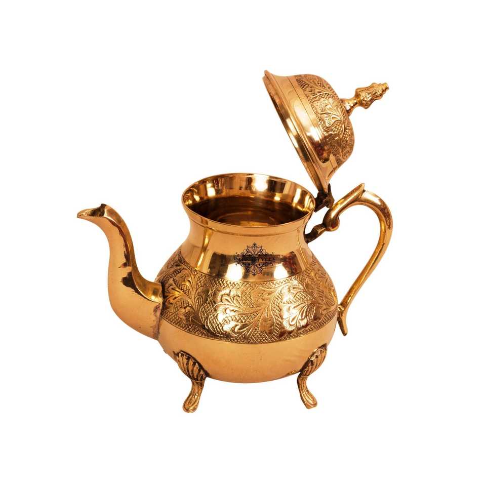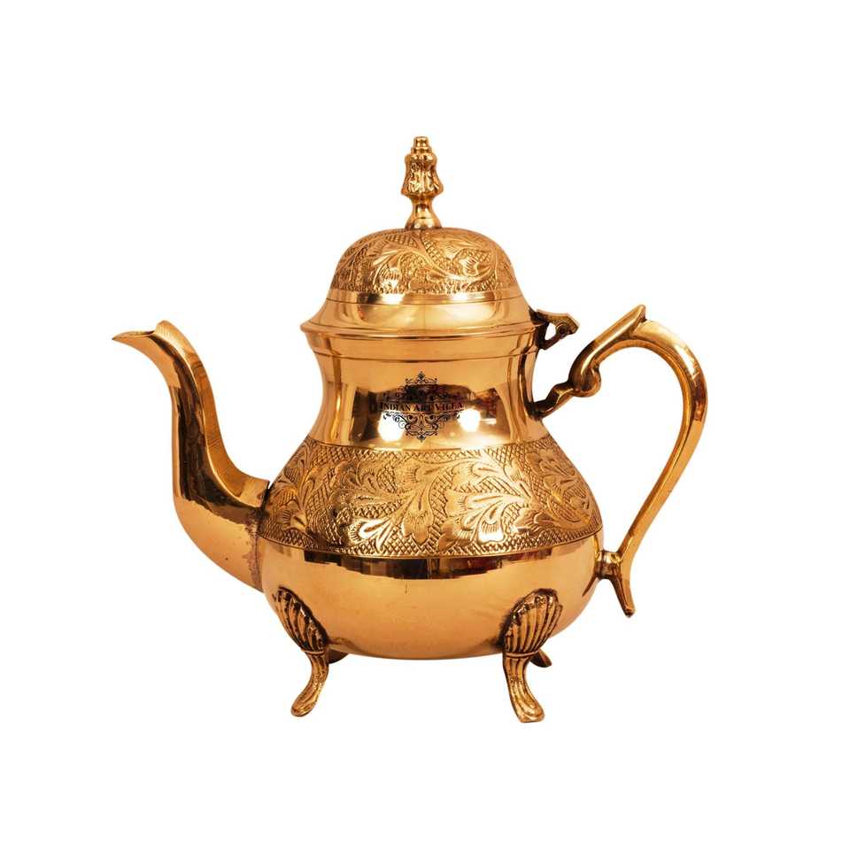 750 ML Mughlai Tea Pot with Leaf Design Made of Pure Brass and Lid Featuring Handle