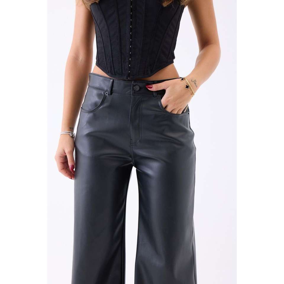 7519 กางเกงขากว้างสีดำเอวสูงทำจากผ้า PU