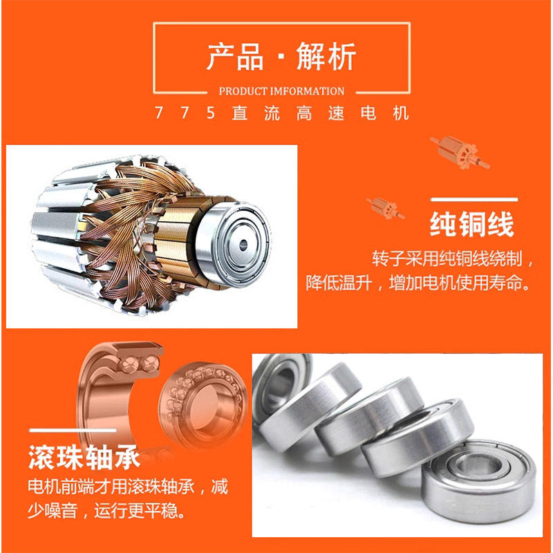 มอเตอร์ลูกปืนความเร็วสูง 775 สำหรับเครื่องบดเครื่องใช้ไฟฟ้าในบ้าน มอเตอร์กระแสตรงแรงบิดสูงสำหรับเครื่องมือไฟฟ้า ได้รับการรับรองมาตรฐาน ROHS