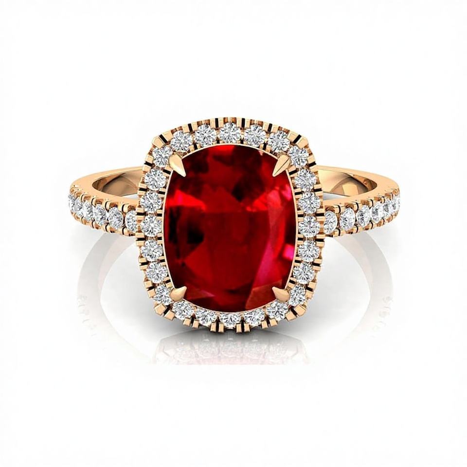 แหวนทองคำแท้ 14k ประดับด้วยพลอยทับทิมสังเคราะห์ทรงคุชชั่นขนาด 7x9 มม. และเพชร พร้อมใบรับรองเพชร สำหรับงานแต่งงานและงานหมั้น