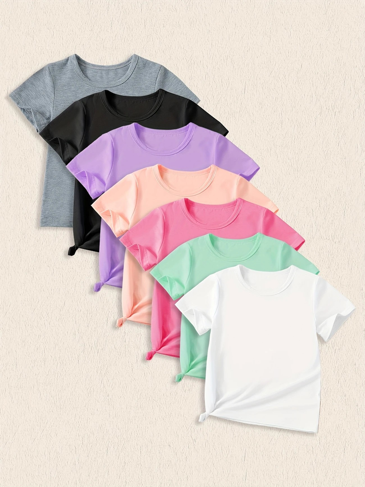 เสื้อยืดแขนสั้นผ้าฝ้าย 100% ระบายอากาศได้ดี เป็นมิตรกับสิ่งแวดล้อม พิมพ์ลายแบบรีดร้อน สีพื้น สำหรับเด็กผู้หญิง 7 ตัว ชุดลำลองฤดูร้อน ใส่ได้ทั้งชายและหญิง