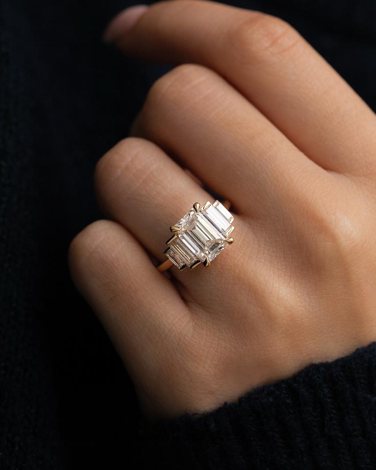 แหวนหมั้นเพชรสังเคราะห์สีทองขนาด7x9มม. ประดับหินด้านข้างทรงบาแกตต์ | เครื่องประดับเจ้าสาวสามชิ้น