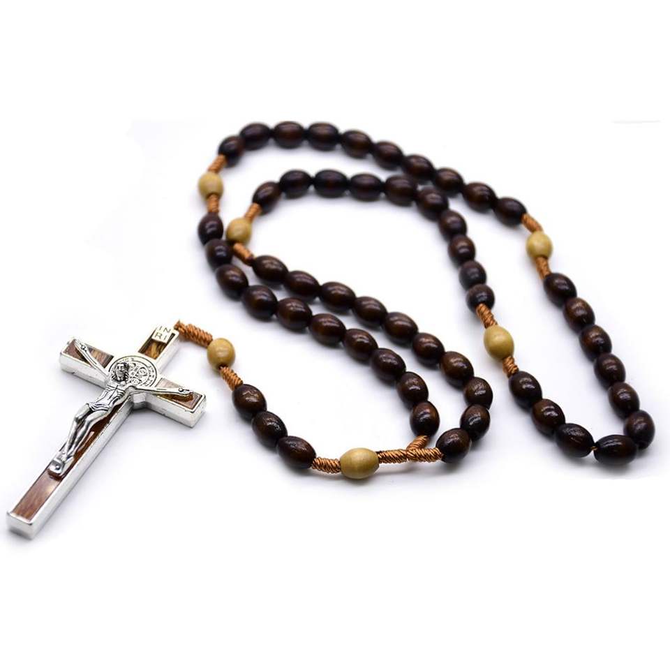 สร้อยคอไข่มุกทรงข้าวสีน้ำตาลเข้ม 8*10 มม. พร้อมสายไม้ไผ่ประดับเพชรแบบถักเป็นร้อย ประดับกับจี้รูปกางเขน สำหรับส่งออก