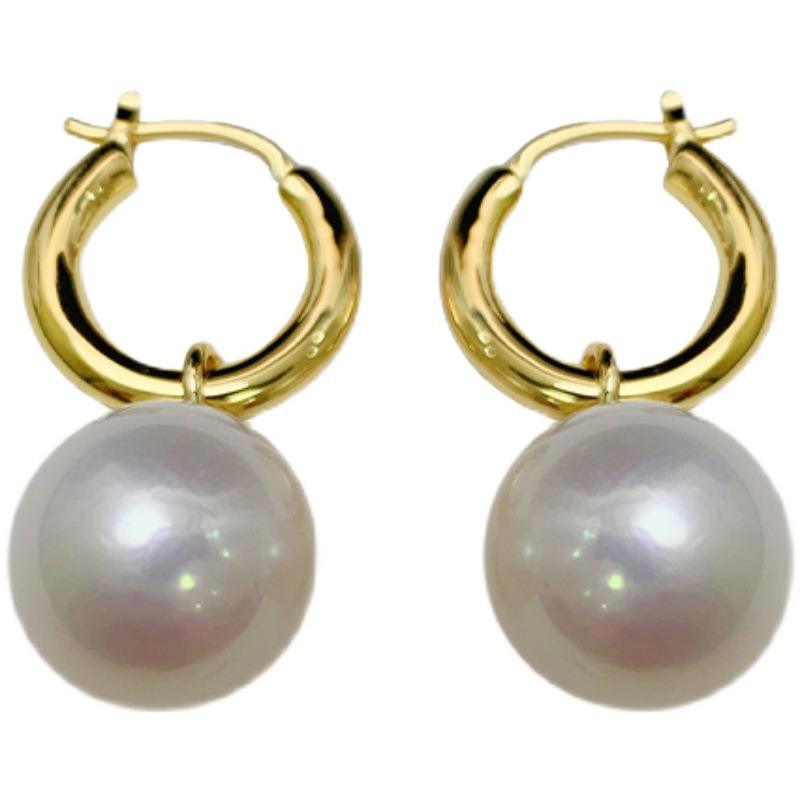 ต่างหูมุกน้ำจืดทรงหยดน้ำขนาด 8-13 มม. รูปทรงเกือบกลม มีตำหนิเล็กน้อย สีขาวมุกประกาย