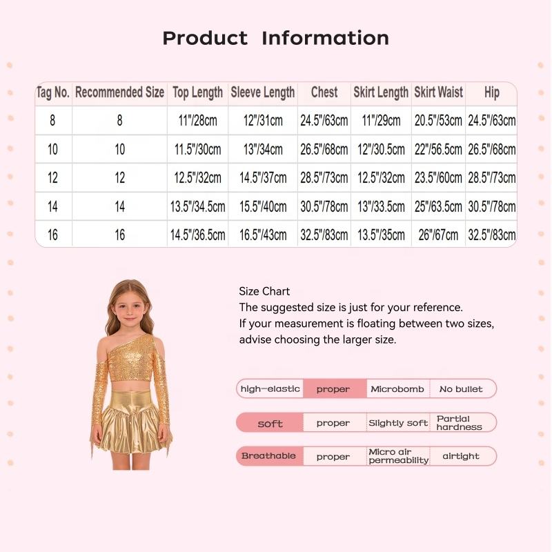 ชุดเต้นรำบอลรูมสำหรับเด็กผู้หญิงอายุ 8-16 ปี ชุดเมทัลลิกสำหรับการแสดงบนเวที เสื้อครอปท็อปพร้อมกระโปรง ชุดสำหรับงานปาร์ตี้ การแสดง งานวันเกิด กระโปรงลาติน ชุดลาติน