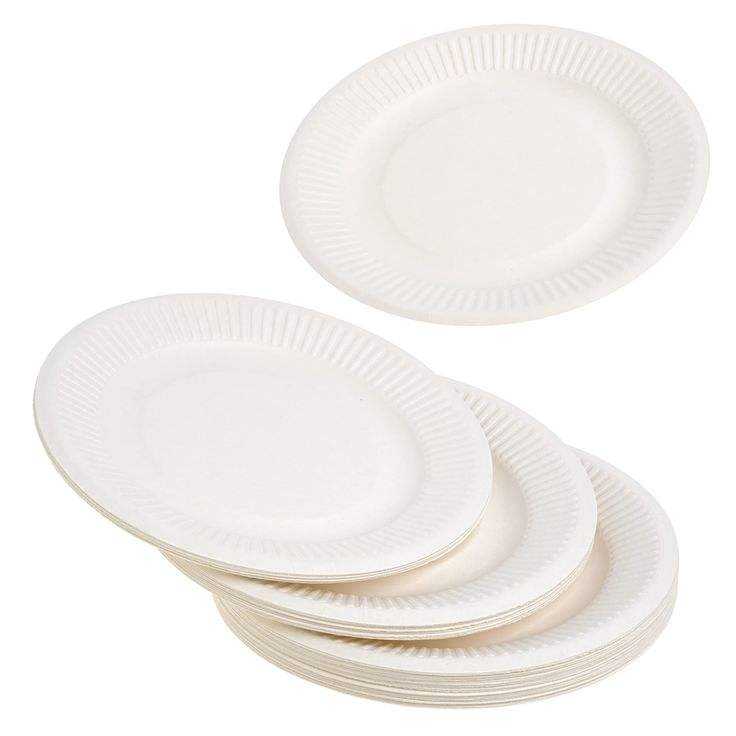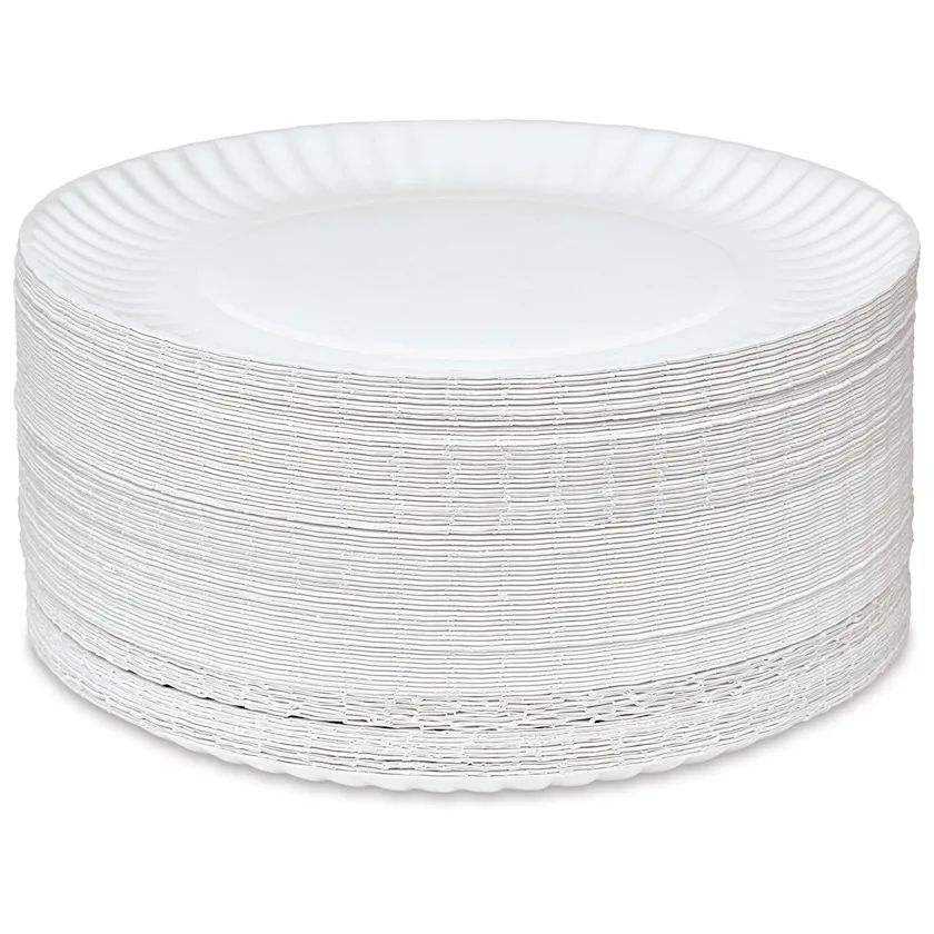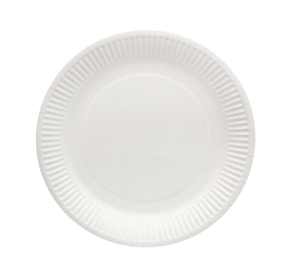 จานกระดาษสีขาวทรงกลมขนาด 8.3 นิ้ว น้ำหนักเบา ใช้แล้วทิ้ง เหมาะสำหรับขนมเด็กและอาหารเด็กเล็ก