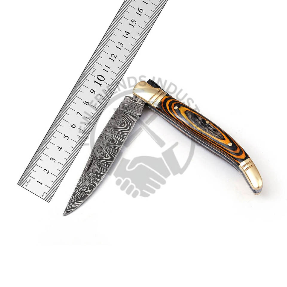 มีดพับ Laguiole ใบมีดเหล็กดามัสกัส ยาว 8.5 นิ้ว มีดพกทำมือคุณภาพเยี่ยม พร้อมด้ามไม้สีน้ำตาลหลายเฉดและปลอกทองเหลือง