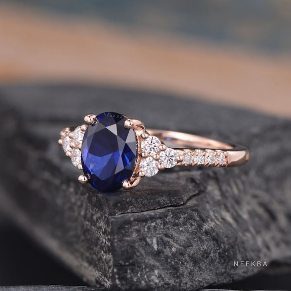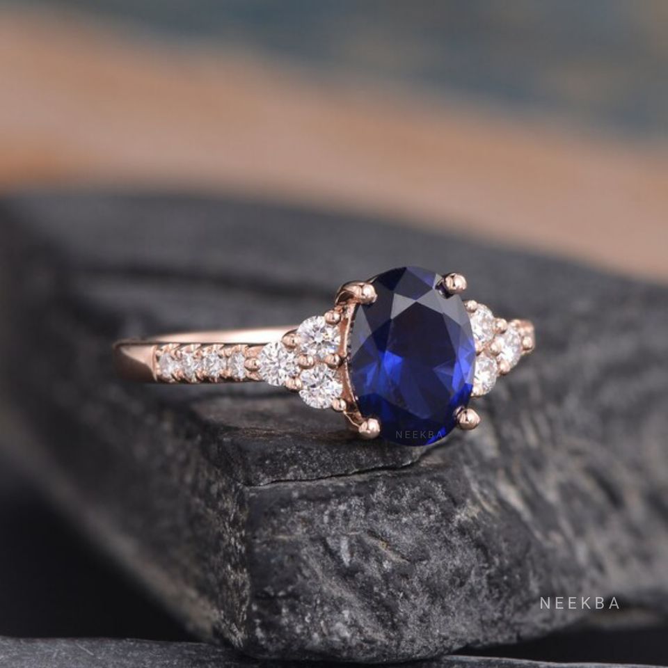 แหวนแซฟไฟร์และโมอิสซาไนต์ทรงวงรีขนาด8*6มม. สำหรับเป็นของขวัญสไตล์อาร์ตเดคโคขนาด14K แหวนสีทองทำด้วยมือ