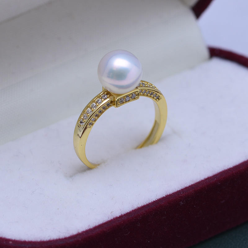 แหวนมุกน้ำจืดทรงกลมสีขาวขนาด 8-9 มม. สำหรับผู้หญิง เงินแท้ S925 ชุดเต็ม ประดับเพชรซิคอนแบบเปิด แสงสว่างมาก ใกล้เคียงกับมุกไร้ตำหนิ