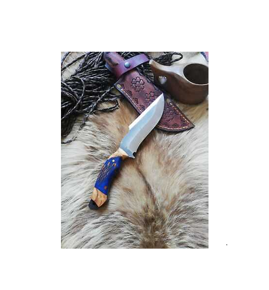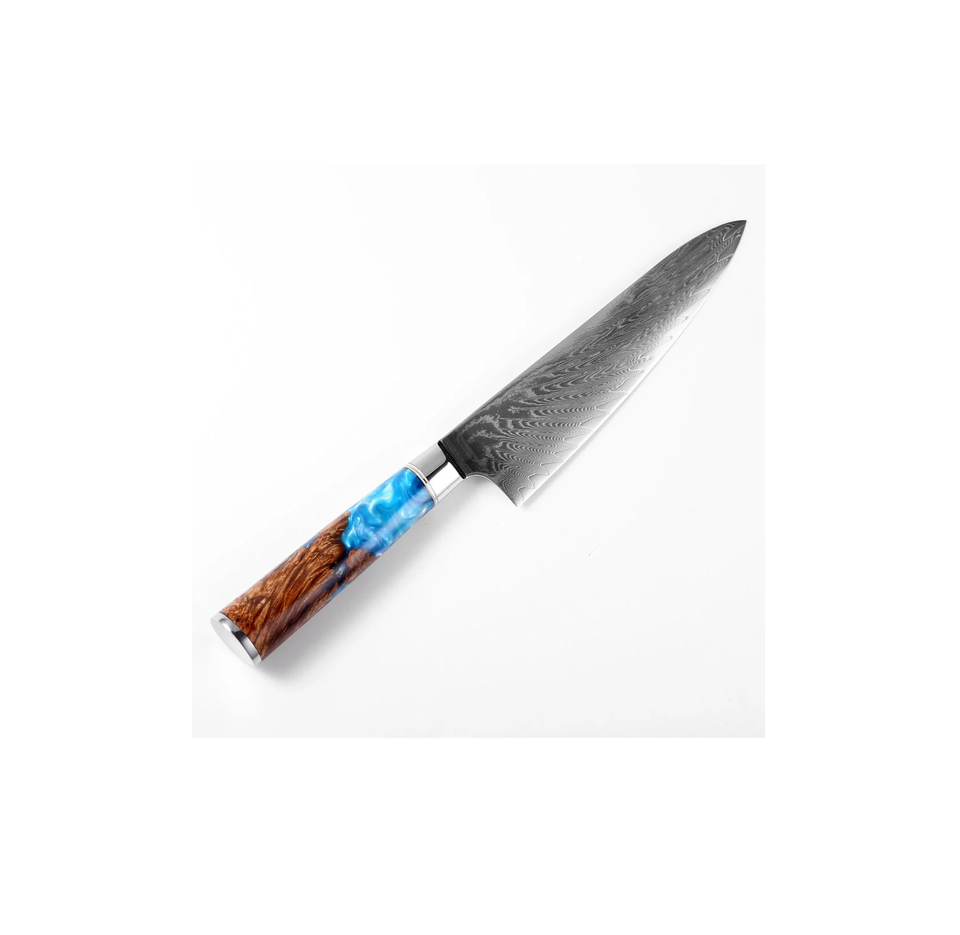 มีดเชฟ8นิ้วทำจากไม้และเรซินดามัสกัสมีดเชฟในครัวมีด้ามจับเรซินสีน้ำเงินเข้ม