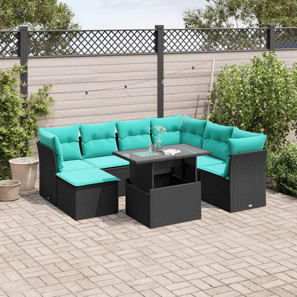 ชุดโซฟาสวนหวายโพลีสีดำ 8 ชิ้นพร้อมเบาะรองนั่ง เฟอร์นิเจอร์กลางแจ้งสไตล์ร่วมสมัยสำหรับใช้ในสวน
