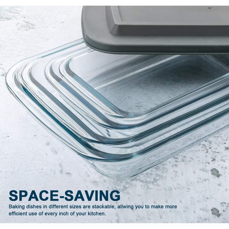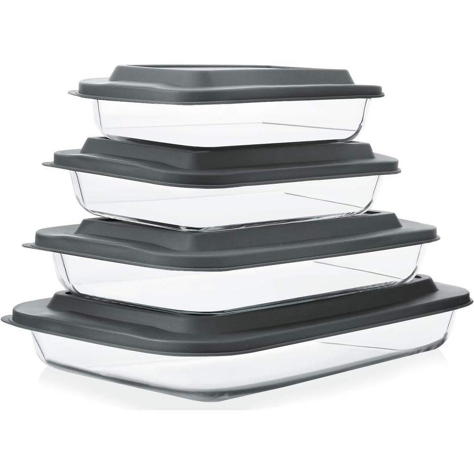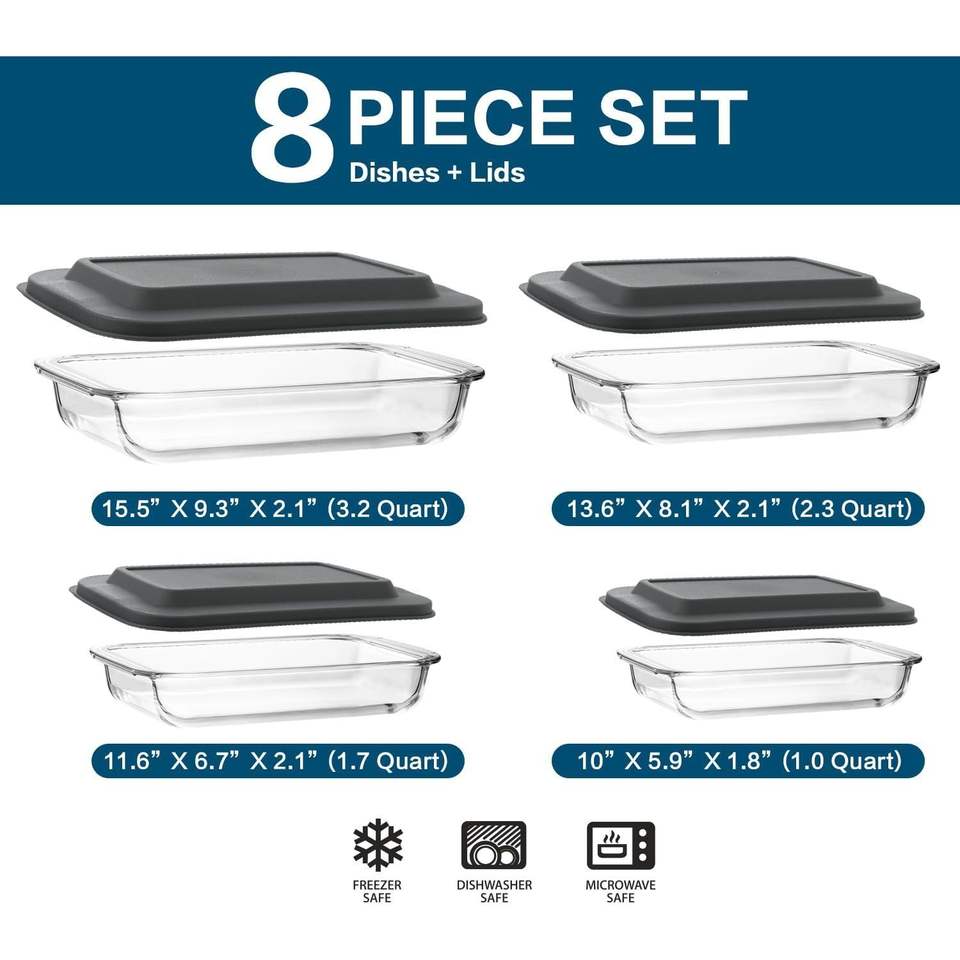 ชุดถาดอบแก้วทรงลึก 8 ชิ้น พร้อมฝาพลาสติก ชุดภาชนะอบแก้วทรงสี่เหลี่ยมสำหรับอาหารเหลือ ถาดสำหรับลาซานญ่า