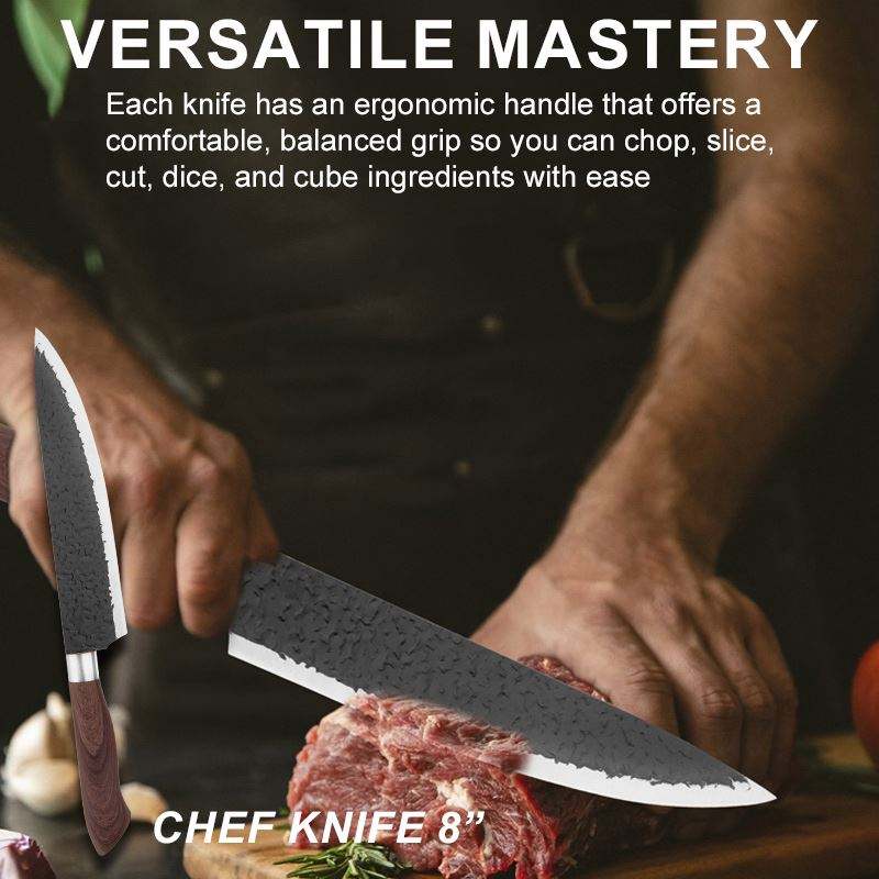 ชุดมีดทำครัวระดับมืออาชีพ 8 ชิ้น ผลิตจากเหล็กกล้าไร้สนิมคาร์บอนสูง คมกริบ ทนทานต่อการเกิดสนิม พร้อมอุปกรณ์ลับคม