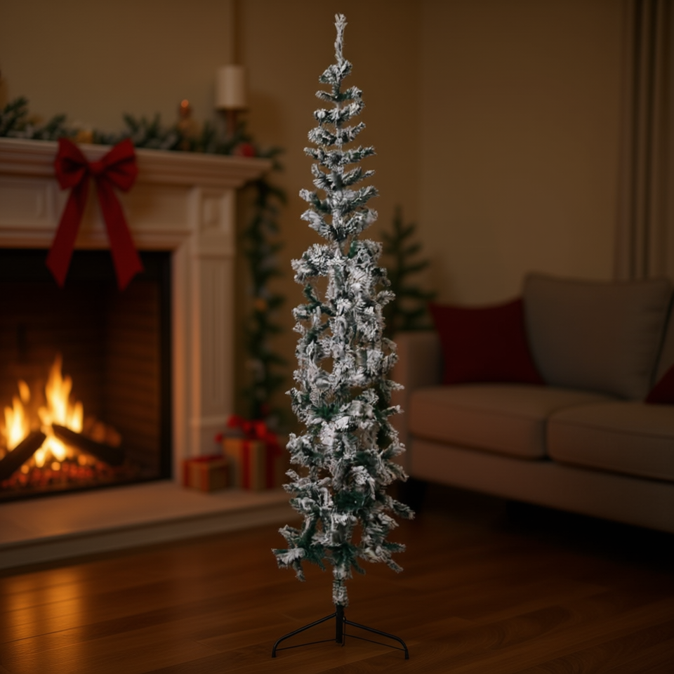 ต้นคริสต์มาสทรงเพรียวบาง D0100HXMLP8 ขนาด 8 ฟุต แบบมีหิมะประดับ ต้นพลาสติกตั้งพื้นสำหรับตกแต่งภายในบ้าน ดีไซน์สวยงามสำหรับเทศกาลวันหยุด