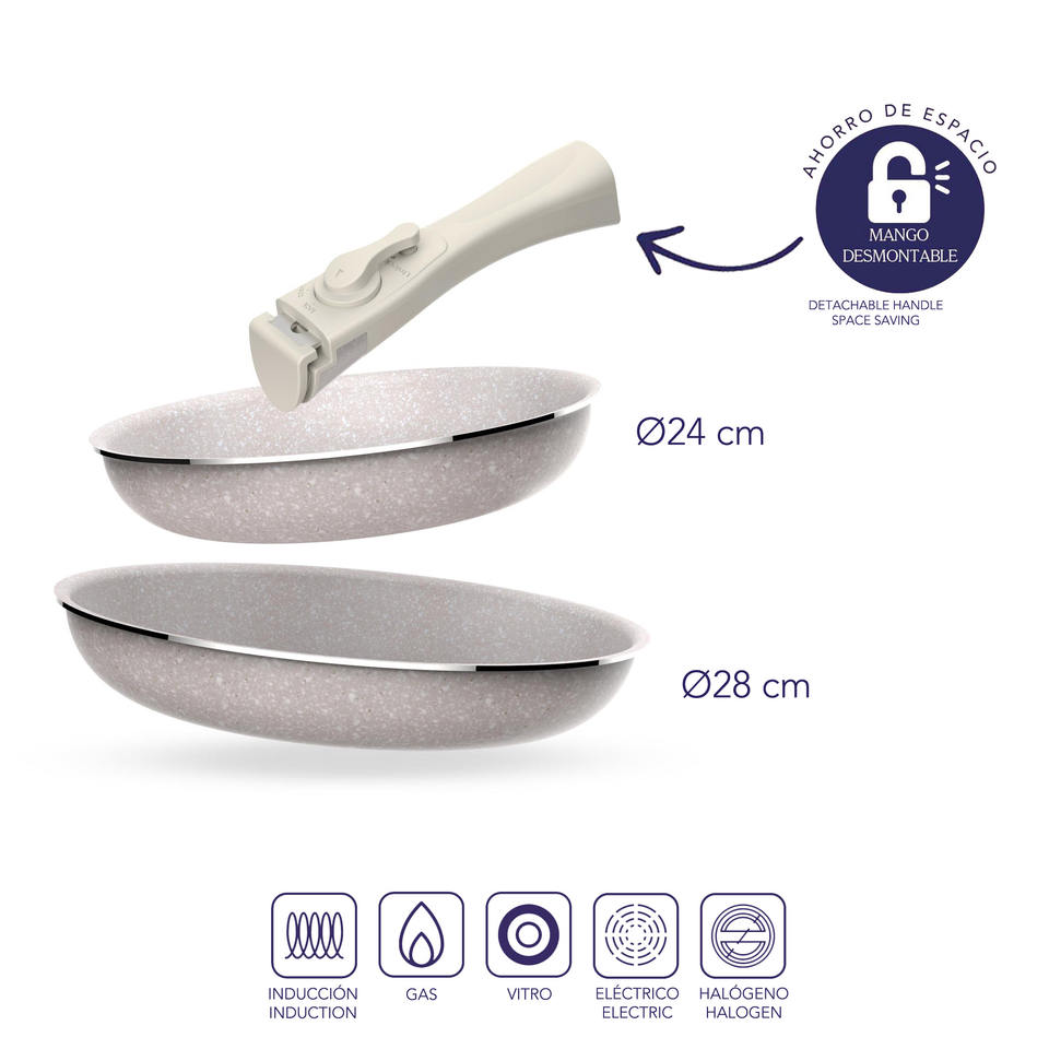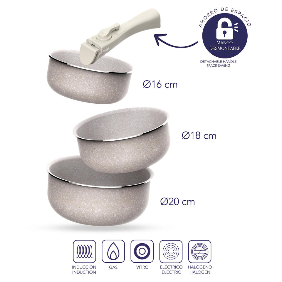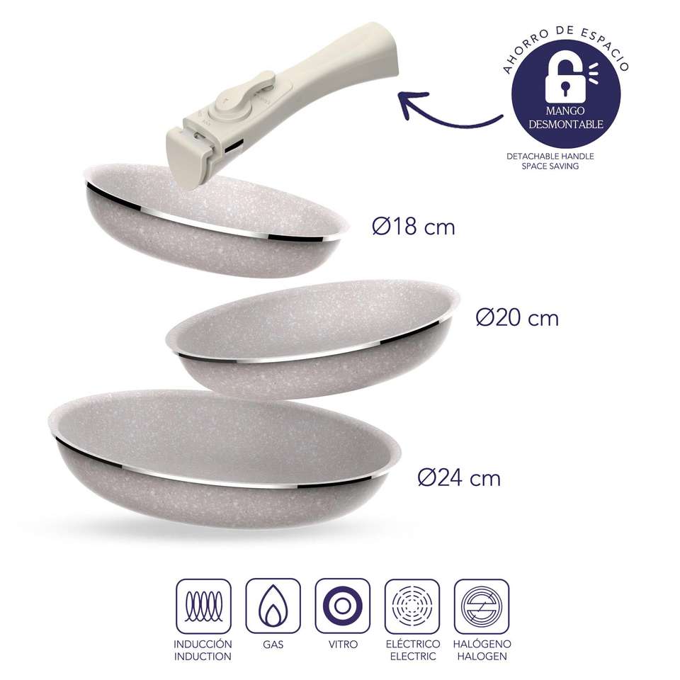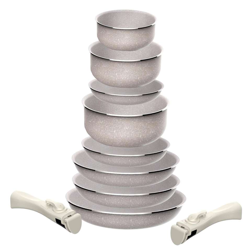 8-piece set: 5 frying pans 18+20+2x 24+28cm and 3 saucepans 16+18+20cm in pressed aluminum with ILAG coating with 3