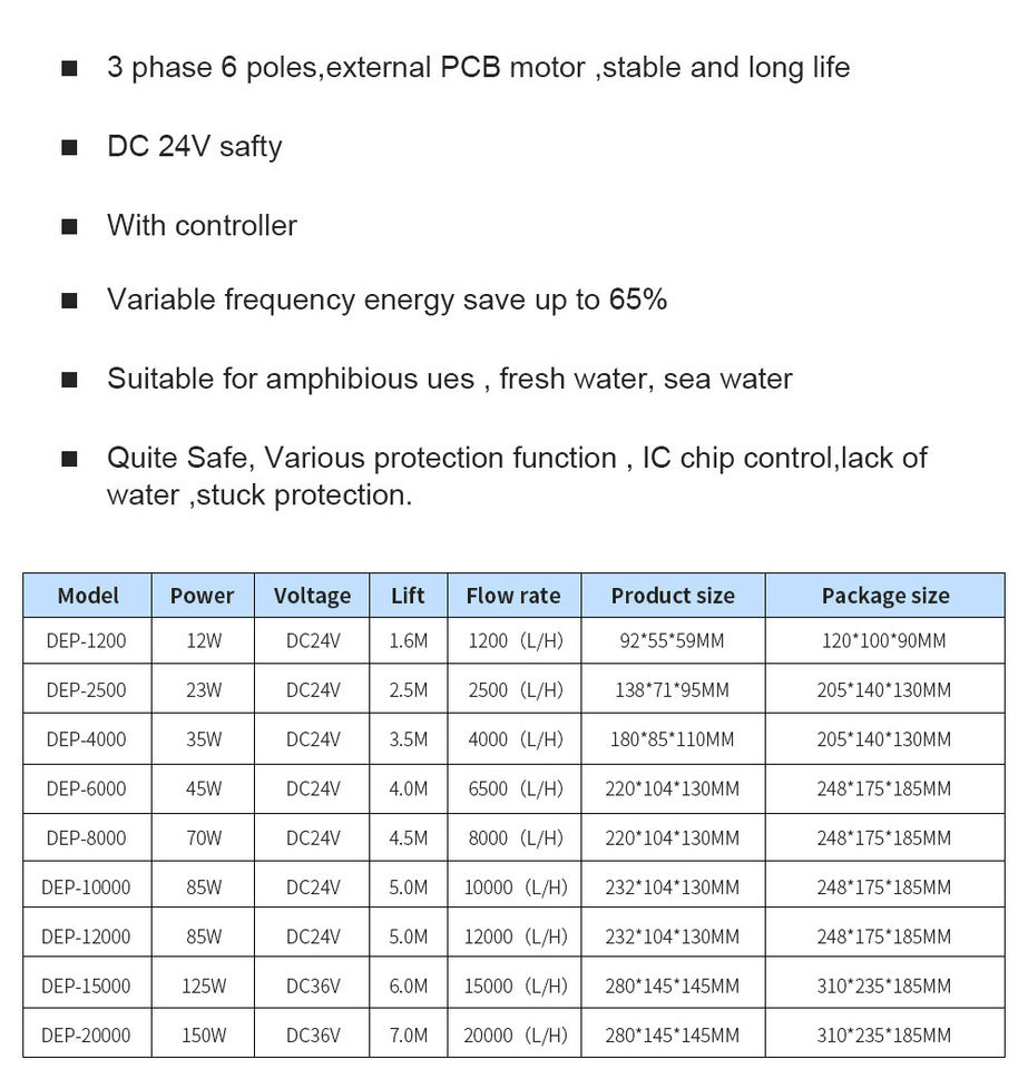 ปั๊มน้ำแบบจุ่มใต้น้ำ 8000 ลิตร/ชม. DC 24V สำหรับตู้ปลาและบ่อ ปั๊มน้ำหมุนเวียน 24v DC ปั๊มจุ่มใต้น้ำสำหรับตู้ปลาแบบสองระบบ