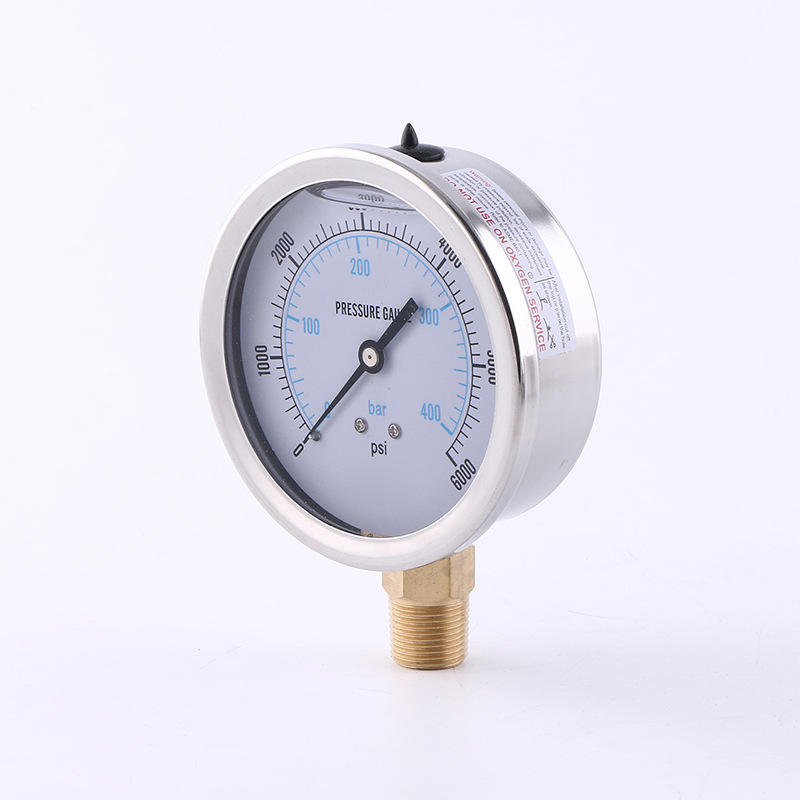 เกจวัดแรงดันแบบเรเดียล 80 มม. ตัวเรือนสแตนเลส บรรจุน้ำมัน ทนแรงกระแทก พร้อมข้อต่อทองแดง สำหรับวัดแรงดันอากาศ