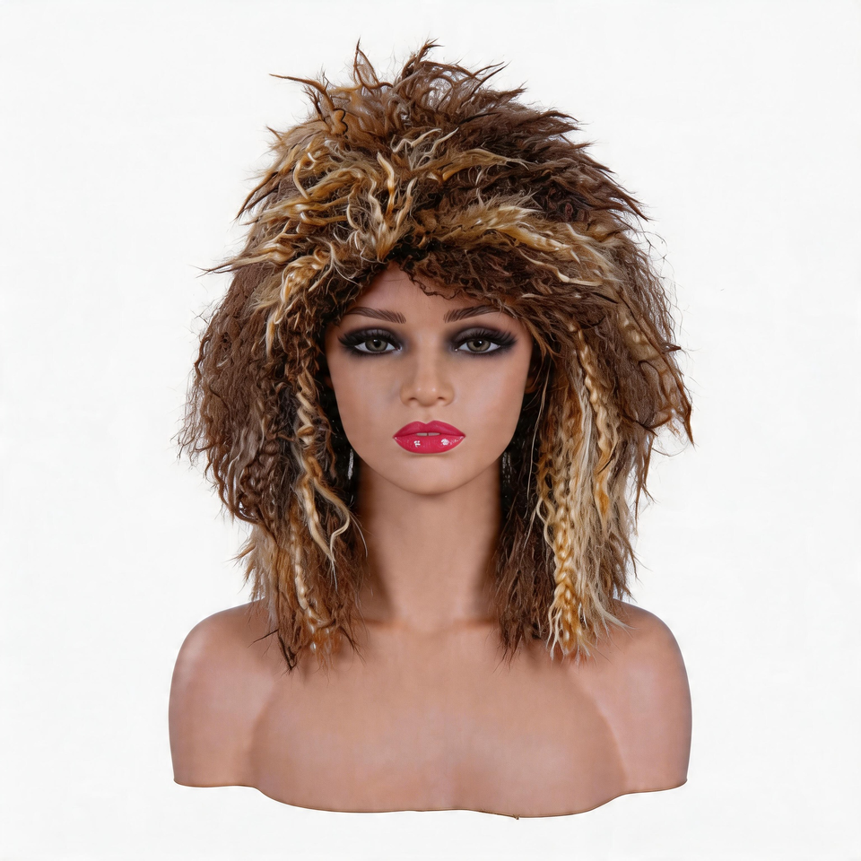 วิกผมสไตล์ร็อคเกอร์ยุค 80 แบบยาวเป็นชั้นๆ สำหรับงานปาร์ตี้คอสเพลย์ จับคู่กับแจ็คเก็ตยีนส์ ข้อมือลายเสือดาว เหมาะสำหรับงานฮาโลวีน