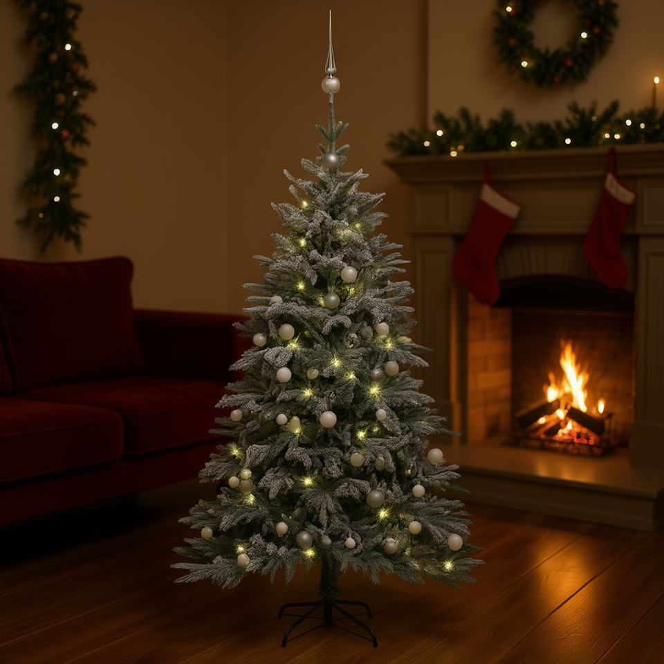 ต้นคริสต์มาส LED ประดิษฐ์ ขนาด 82.7 นิ้ว ตกแต่งด้วยหิมะและลูกบอล วัสดุ PVC PE สำหรับตกแต่งภายในบ้าน ใช้ปลั๊กไฟ น้ำหนักเบา ติดตั้งง่าย