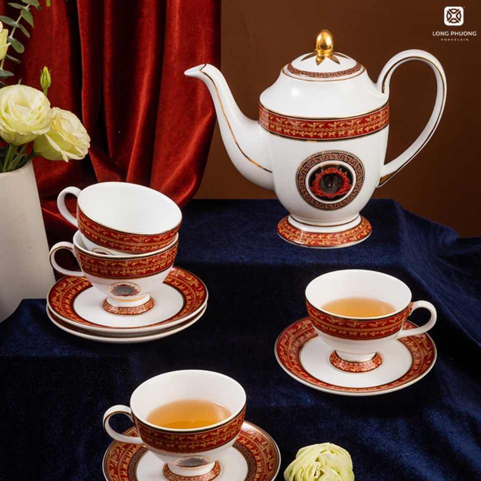 ชุดน้ำชาเซรามิกวินเทจ820มล. สไตล์ครั่งหง/เครื่องลายครามหรูหรา | กลุ่ม Phuong ยาว