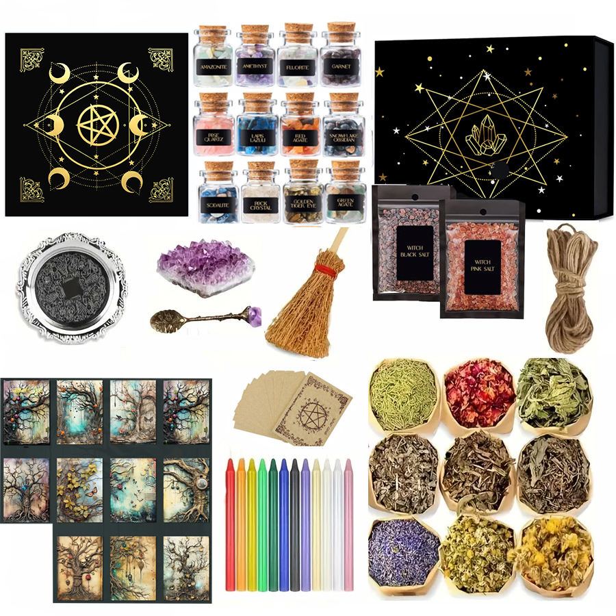 ชุดอุปกรณ์แม่มด 84 ชิ้น ประกอบด้วยหินคริสตัล สมุนไพร เทียน ของตกแต่งวิญญาณ ของขวัญฮาโลวีนสำหรับเพื่อน