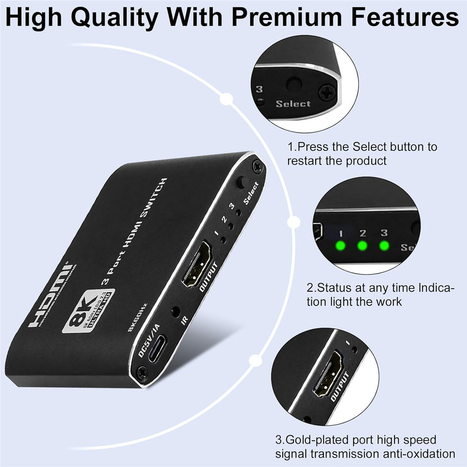 3-พอร์ต HDMI สวิตช์ IR ระยะไกล:ตัวสลับ2.1 HDMI 8K 60Hz
