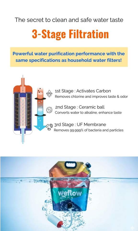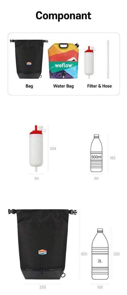 ระบบกรองน้ำแบบพกพา 8 ลิตร ใช้แรงโน้มถ่วง สำหรับตั้งแคมป์ แบบพับเก็บได้ ไหลแรง ใช้กลางแจ้ง ระบบกรอง 2 ขั้นตอน รุ่น Weflow