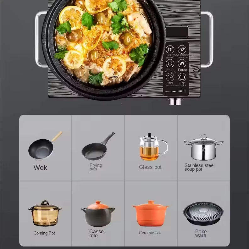 เตาไฟฟ้าอินฟราเรดแบบเดี่ยว 8P หน้าจอสัมผัส ปุ่มควบคุมดิจิตอล 2000W แบตเตอรี่อัจฉริยะ แบบเสียบปลั๊ก 100-240V ระดับประหยัดพลังงาน 3 มาตรฐาน CE