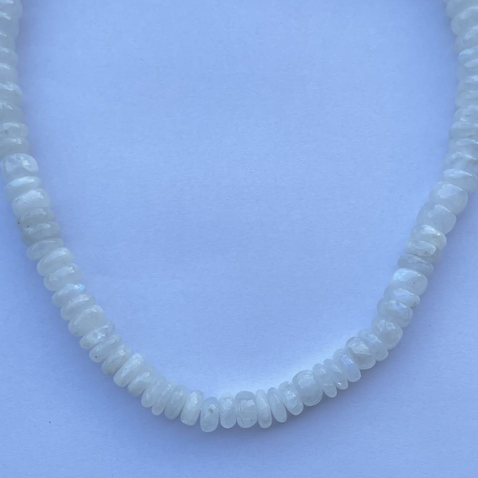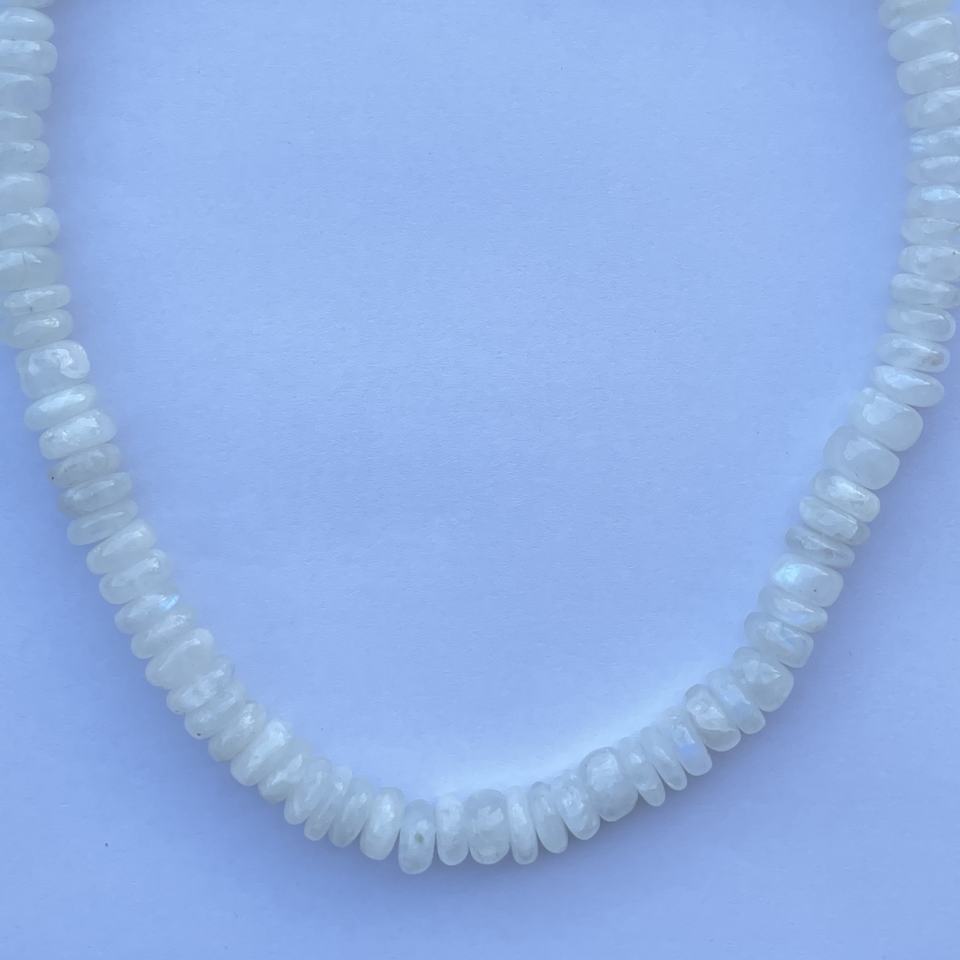 สร้อยคอหินมูนสโตนสีรุ้งธรรมชาติ ทรงรอนเดลล์เรียบ ประดับลูกปัด