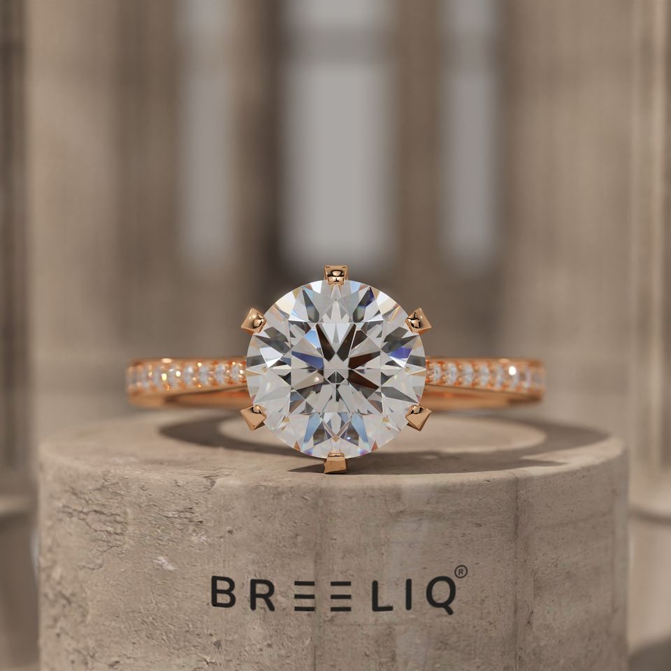 แหวนหมั้นมอสซาไนต์ทรงกลมขนาด 8 มม. ประดับเพชรกลาง 2.00 กะรัต แหวนเงินชุบทอง 14K พร้อมวงแหวนแบบ Pave สำหรับผู้หญิง เครื่องประดับเจ้าสาว