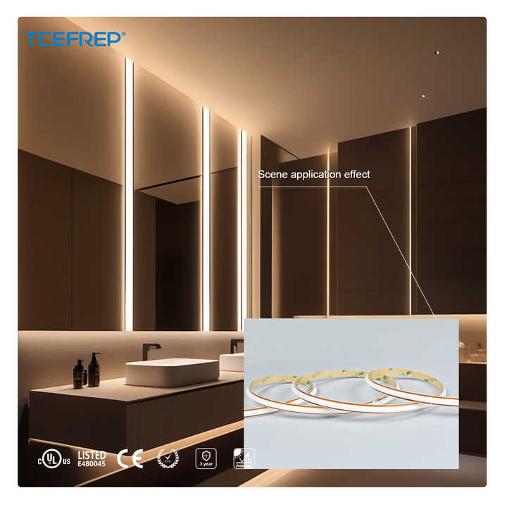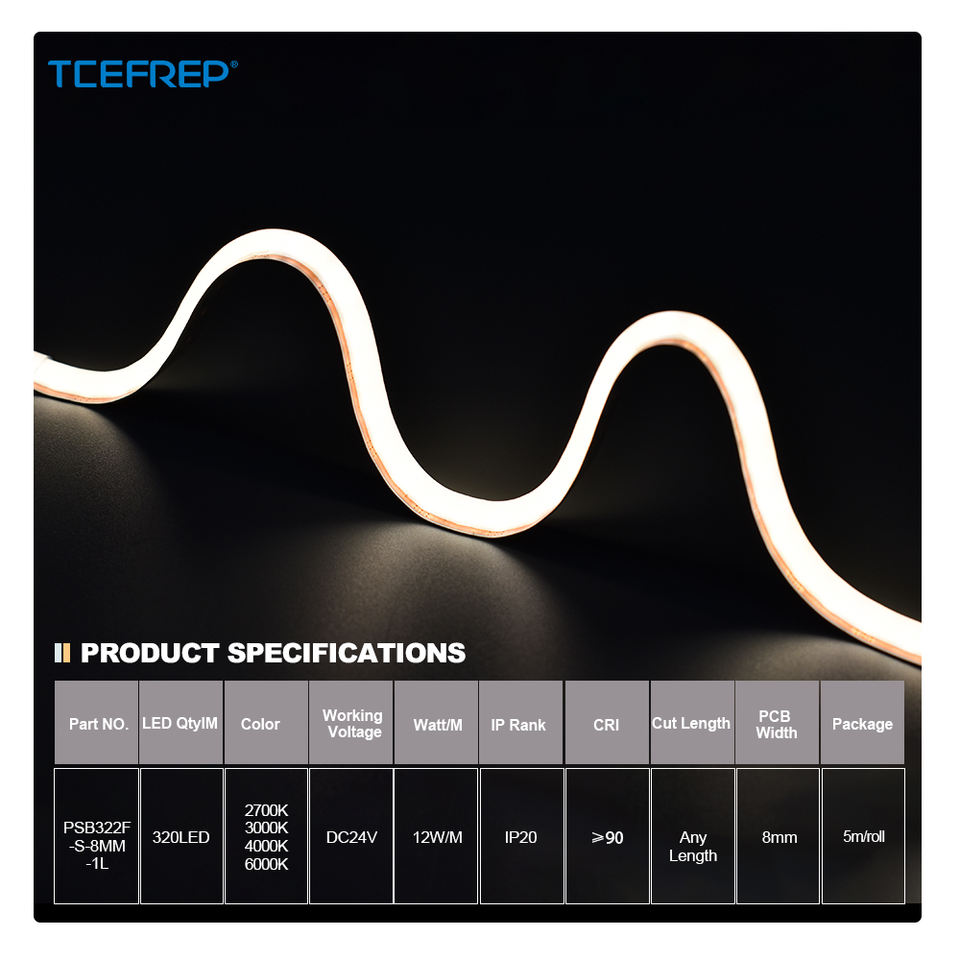 แถบไฟ LED แบบ COB บนแผงวงจรพิมพ์บาง 8 มม. 320 ดวง 12 วัตต์ กระแสตรง 24 โวลต์ 2700K ถึง 6500K ตัวเลือก IP20 ค่า CRI สูง 90 ตัดตามความยาวที่ต้องการได้