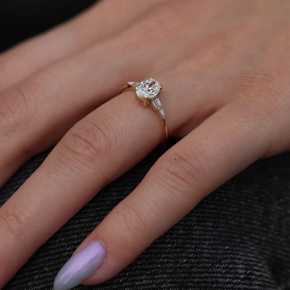 แหวนหมั้นเพชร CZ ทรงวงรีตัดกับบาแกตขนาด8x6มม. แหวนทองคำ925สีเงิน | งานแต่งงานครบรอบแต่งงานแหวนสั่งทำ
