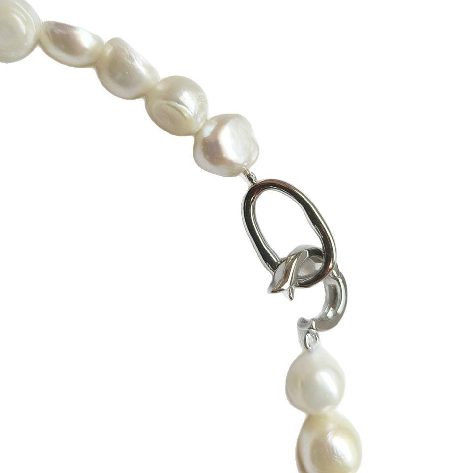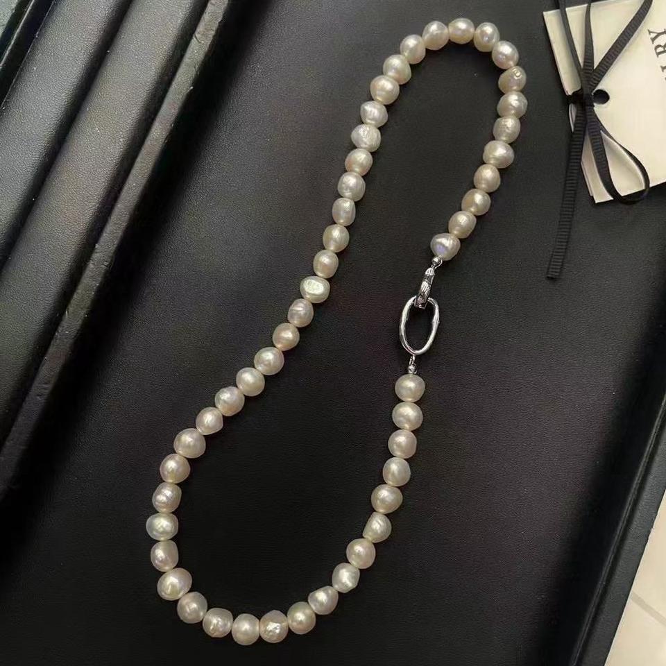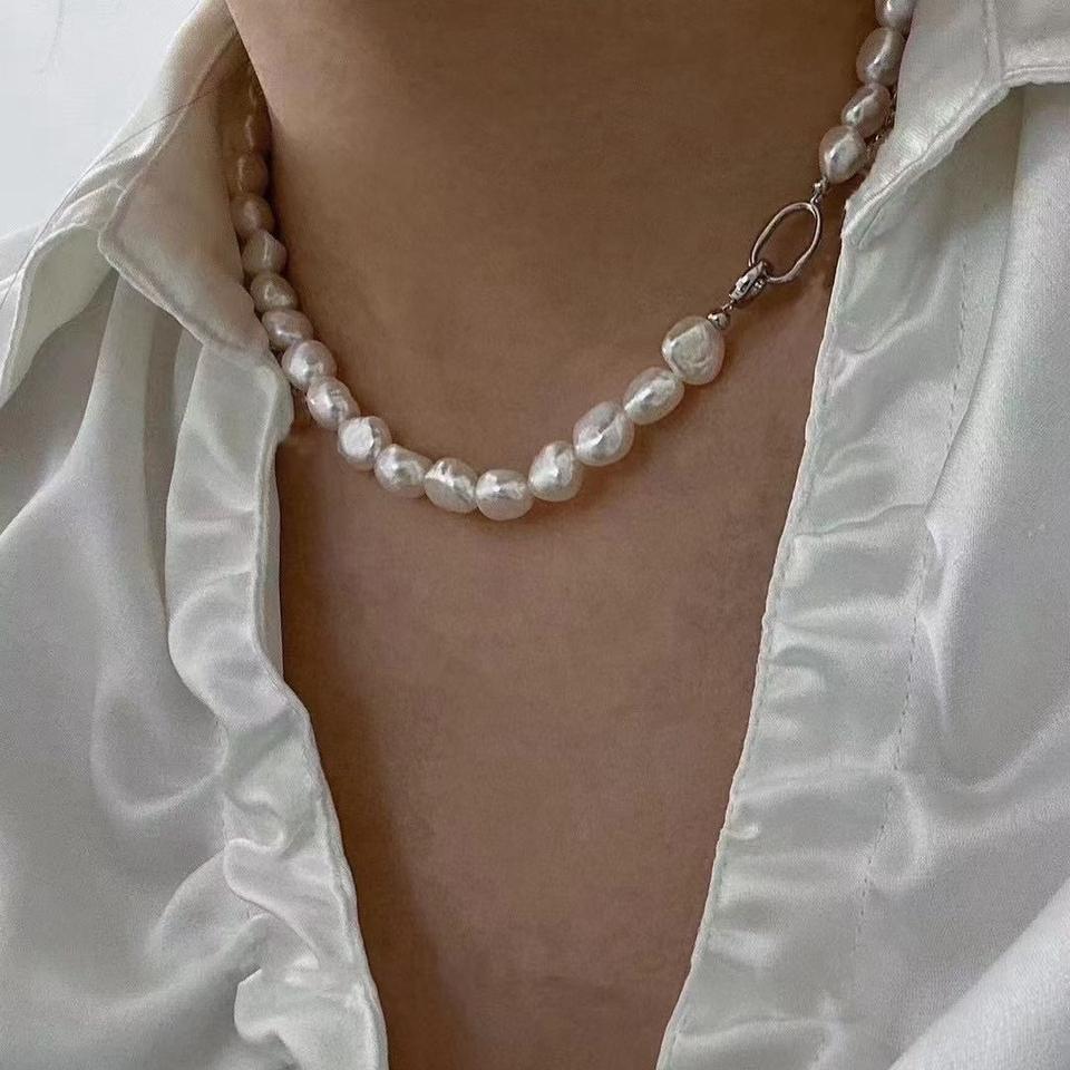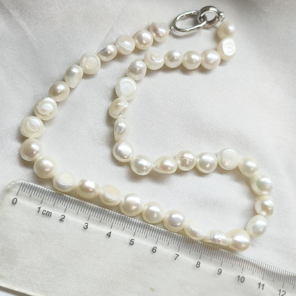 สร้อยคอมุกน้ำจืดทรงบาร็อคขนาด 9-10 มม. รูปทรงไม่สม่ำเสมอ ขนาดใหญ่ ไม่ใช่ไข่มุกแกน มีความเงางาม หรูหราและมีสไตล์
