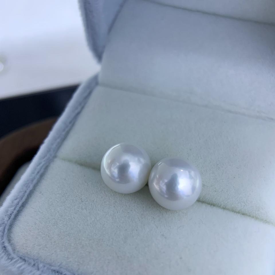 ต่างหูมุกน้ำจืดทรงกลมขนาด 9-10 มม. สีขาวสว่าง แบบมีตำหนิเล็กน้อย ดีไซน์ทันสมัย