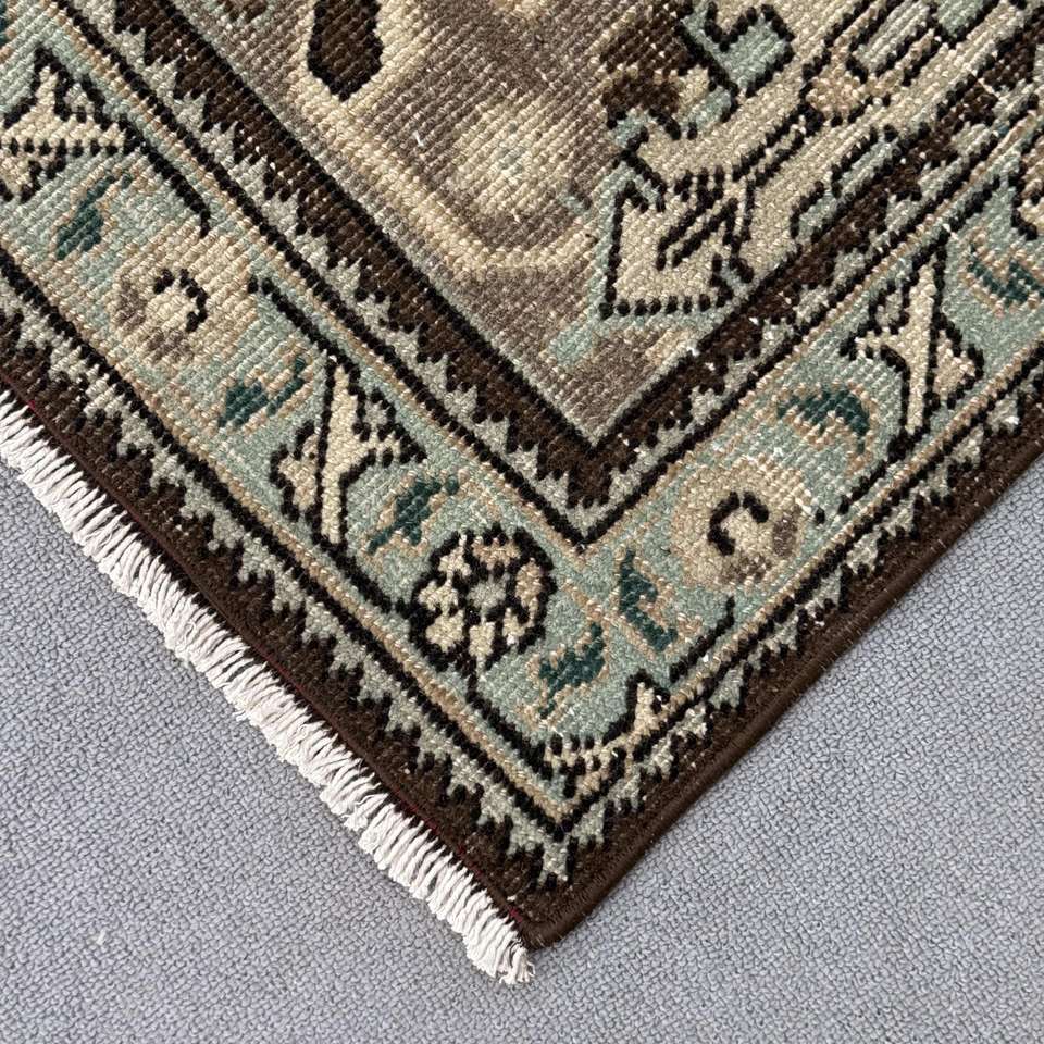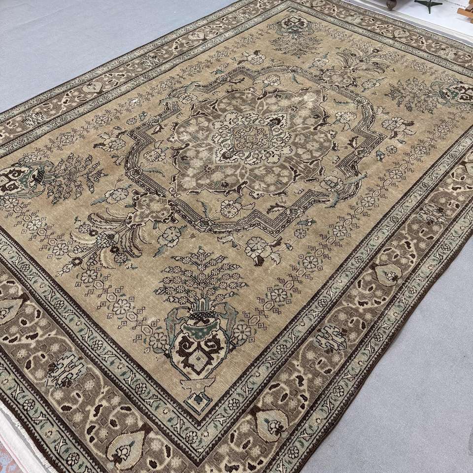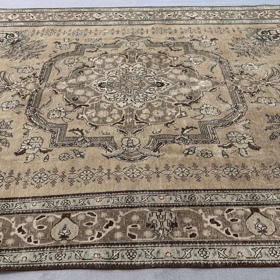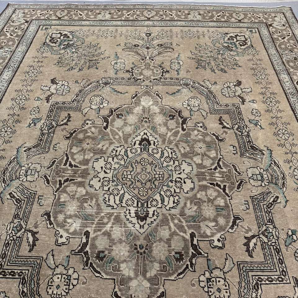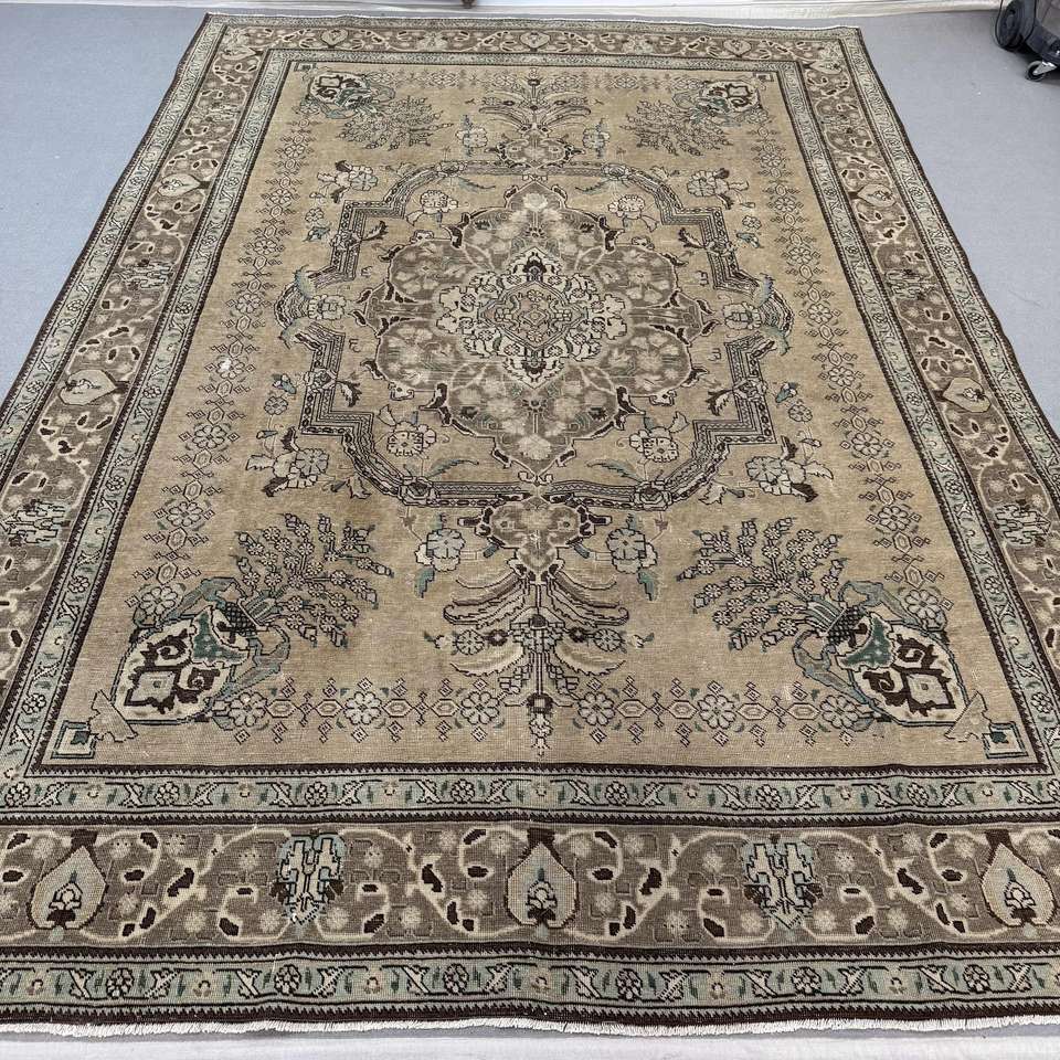 พรมวินเทจขนาดใหญ่พิเศษ 9.4x13 ฟุต พรมตุรกี พรมขนสัตว์สีน้ำตาลน้ำเงินสไตล์โอเรียนทัล
